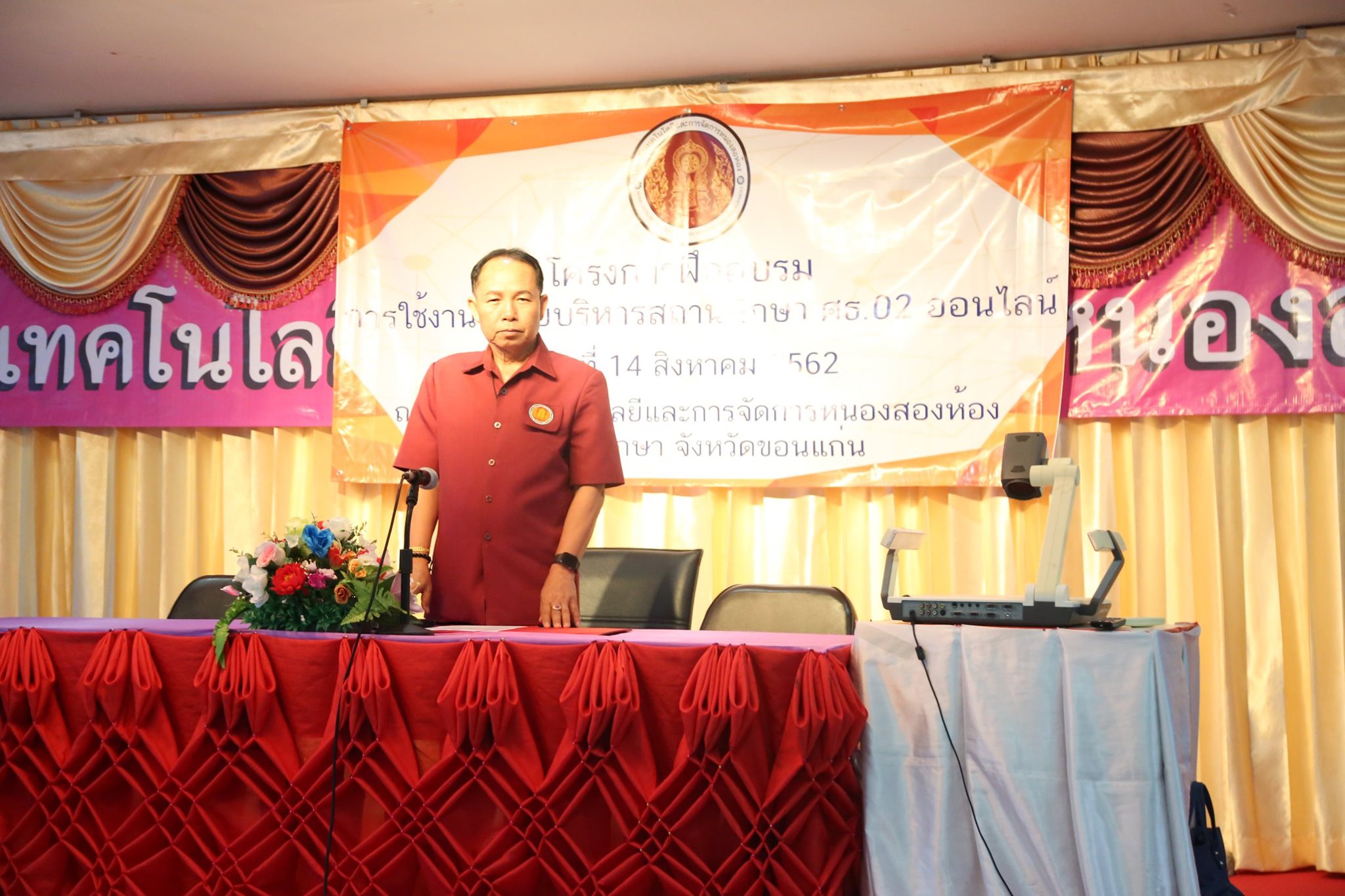 วันที่ 14 สิงหาคม 2562 นายถาวรสิทธิ์ อินทะแสง ผู้อำนวยการวิทยาลัยเทคโนโลยีและการจัดการหนองสองห้อง ได้รับเกียรติให้มาเป็นประธานในพิธีเปิดโครงการอบรมการใช้งานระบบบริหารสถานศึกษา ศธ.02 ออนไลน์ โดยนายเทียนชัย มูลดามาตย์ รองผู้อำนวยการฝ่ายวิชาการ กล่าวรายงานวัตถุประสงค์ในการจัดโครงการในครั้งนี้