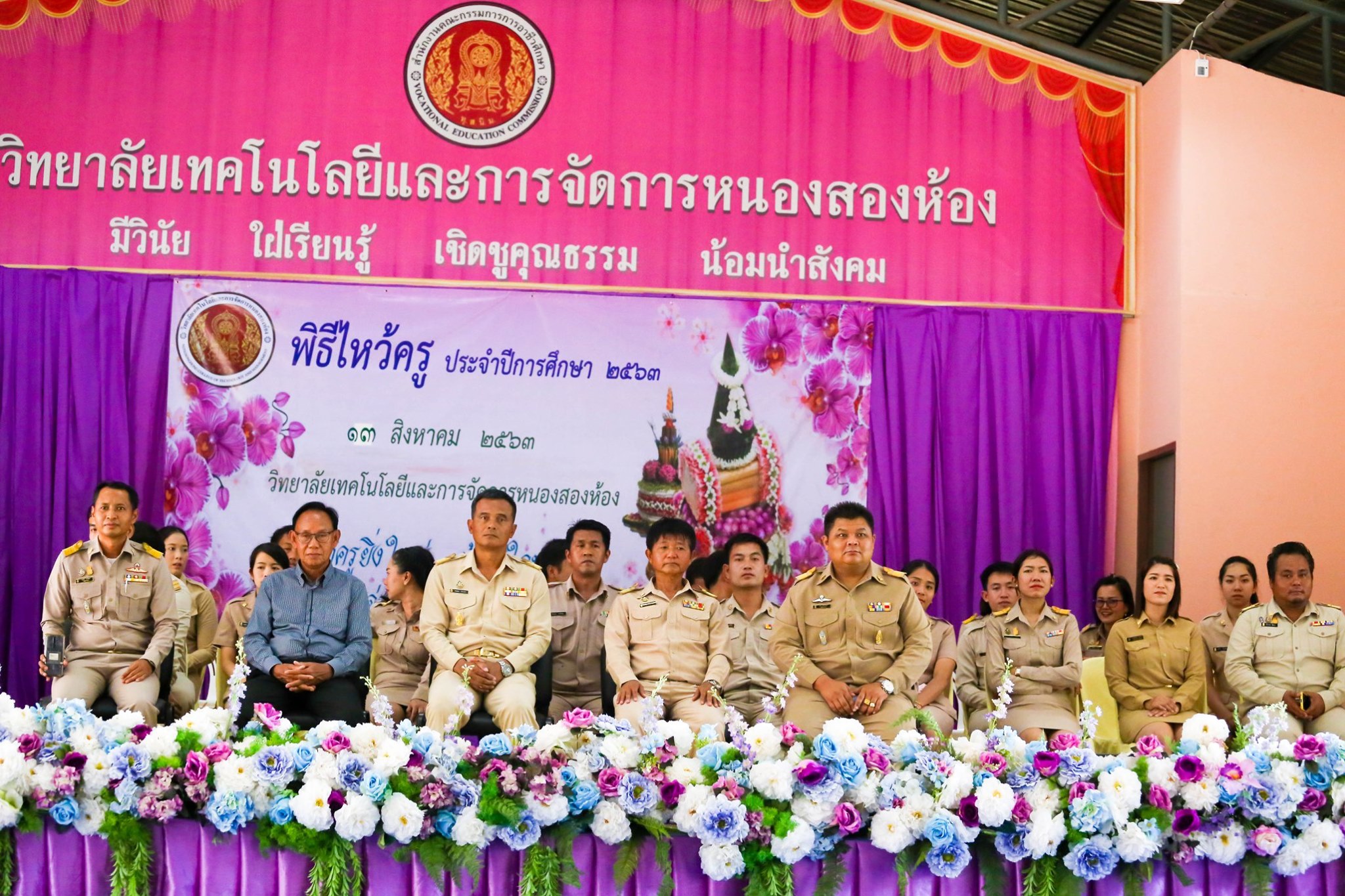 วันพฤหัสบดี ที่ 13 สิงหาคม 2563 วิทยาลัยเทคโนโลยีและการจัดการหนองสองห้อง ได้จัดพิธีไหว้ครู ประจำปีการศึกษา 2563 และมอบทุนการศึกษา สำหรับนักเรียน นักศึกษาที่มีจิตอาสาสาธาณะ มีความประพฤติเรียบร้อย กิจกรรมเด่น และนายสิริสมัย เย็มรัมย์ ผู้อำนวยการวิทยาลัยเทคโนโลยีและการจัดการหนองสองห้อง กล่าวให้โอวาทแก่ นักเรียน นักศึกษา ณ อาคารโรงอาหารเอนกประสงค์ วิทยาลัยเทคโนโลยีและการจัดการหนองสองห้อง