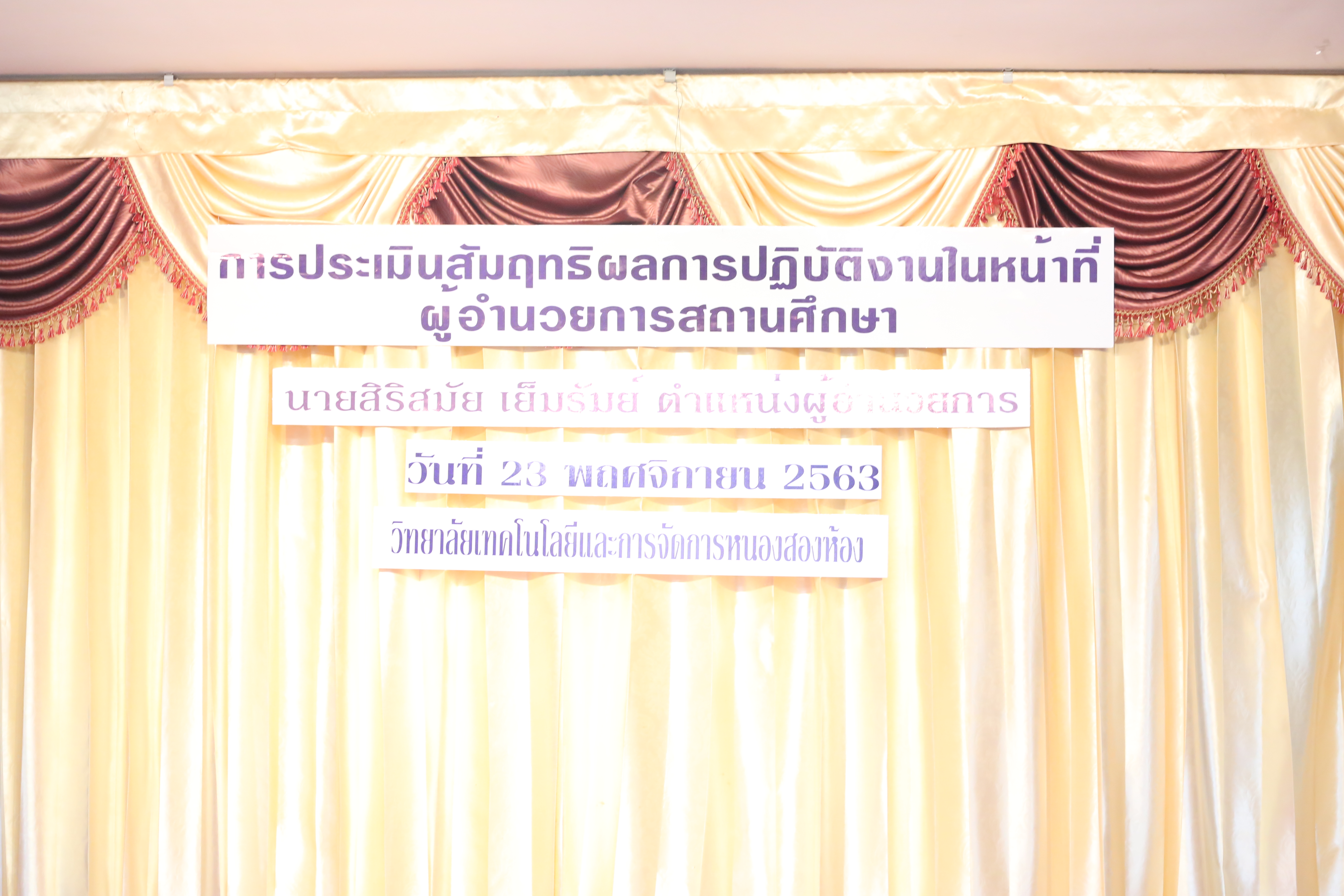 วันที่ 23 พฤศจิกายน 2563 ดร.อดุลย์ พิมพ์ทอง ดร.ยุทธศาสตร์ กงเพ็ชร และว่าที่ร้อยตรี ดร.จรรยา พาบุ เข้าประเมินสัมฤทธิ์ผลการปฏิบัติงานในหน้าที่ผู้อำนวยการสถานสถานศึกษา นายสิริสมัย เย็มรัมย์ ผู้อำนวยการวิทยาลัยเทคโนโลยและการจัดการหนองสองห้อง ณ ห้องประชุมชั้น 2 อาคารอำนวยการ วิทยาลัยเทคโนโลยีและการจัดการหนองสองห้อง