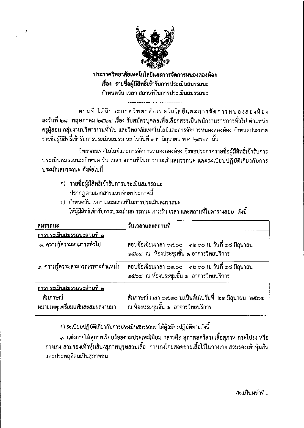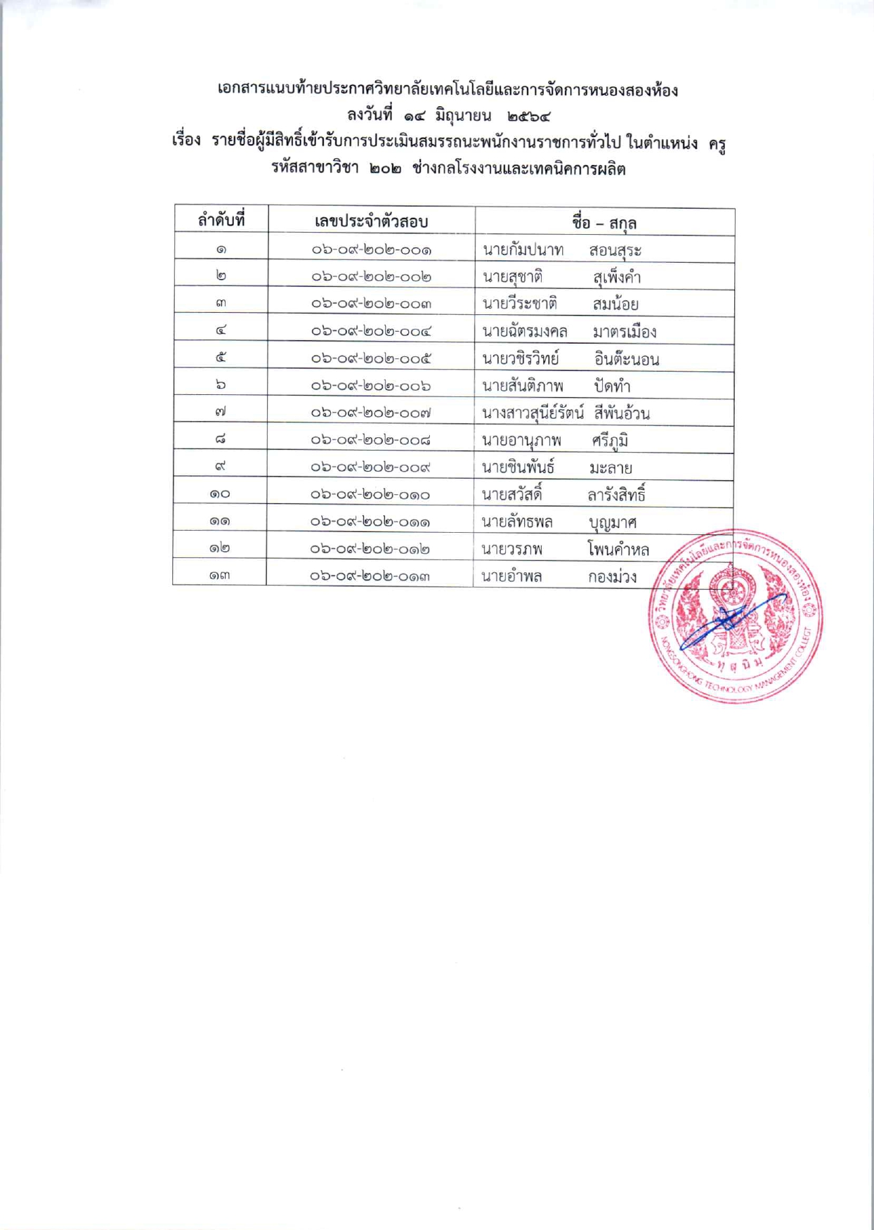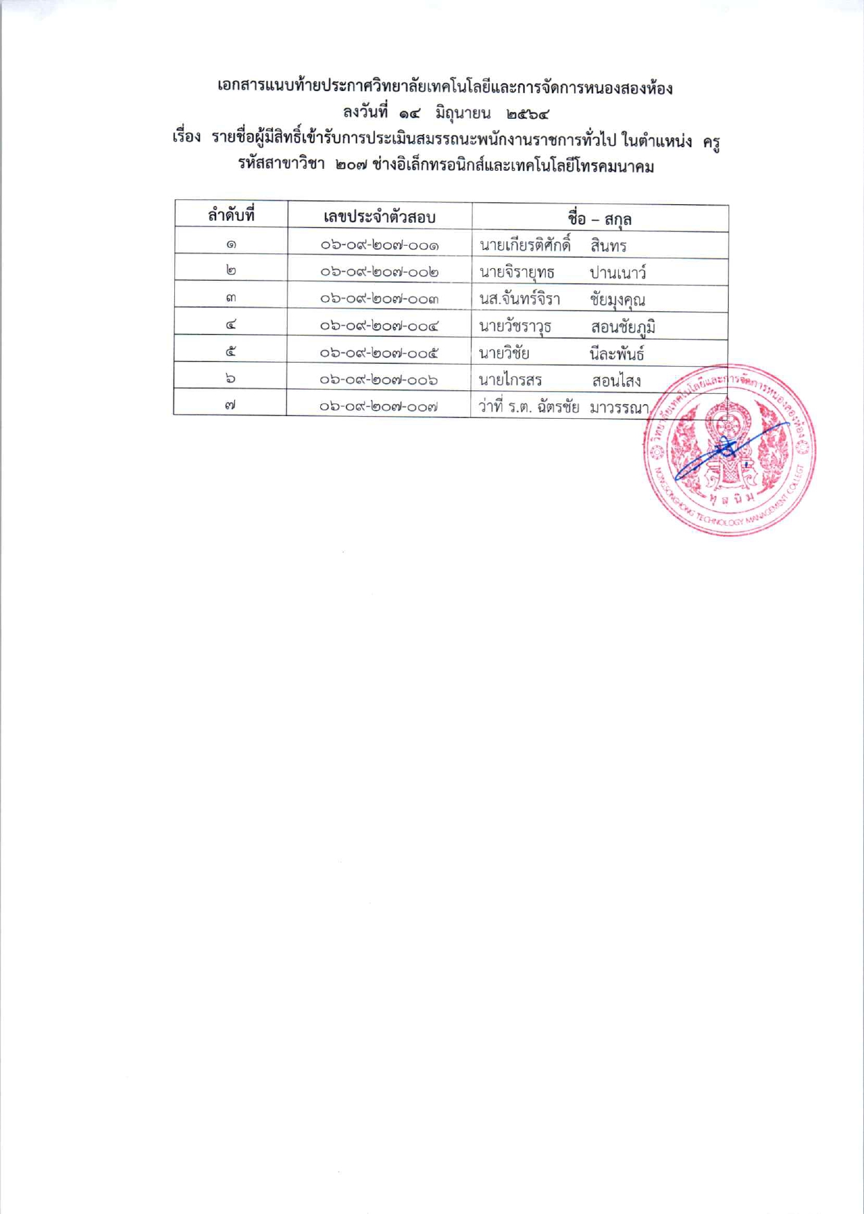 รายชื่อผู้มีสิทธิ์เข้ารับการประเมินสมถรรณนะ เพื่อเลือกสรรเป็นพนักงานราชการทั่วไป ตำแหน่งครูผู้สอน