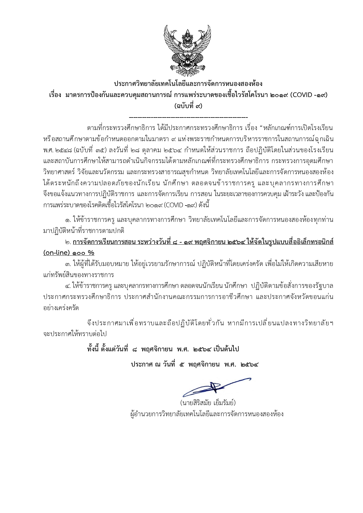ประกาศการจัดการเรียนการสอนออนไลน์ ฉบับที่ 9